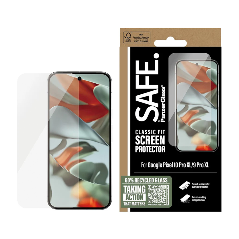 SAFE. is for real. SAFE. is for you. SAFE. is for dance floor mishaps, selfies gone wrong and your everyday fumbling, dropping and screen cracking. This SAFE. by PanzerGlass® screen protector made of 60% recycled material acts as a discrete airbag, protecting your phone by absorbing impacts and providing high-level scratch resistance without compromising the functionality and look of your device. It even has a smudge-free coating that reduces traces of fingerprints and grease.