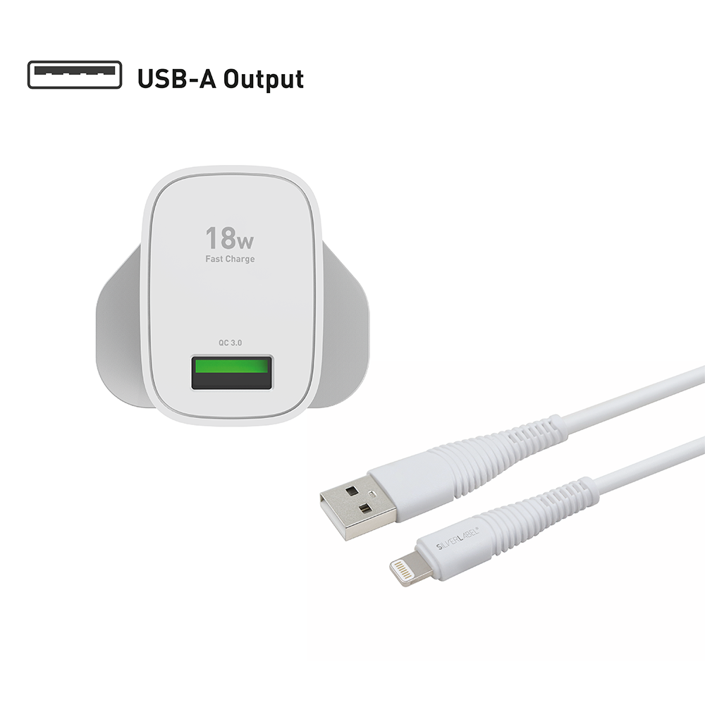 Power up your devices in a flash with our fast charge 18W USB-A Wall Charger and Lightning Cable bundle - the ultimate duo for swift charging wherever you go.